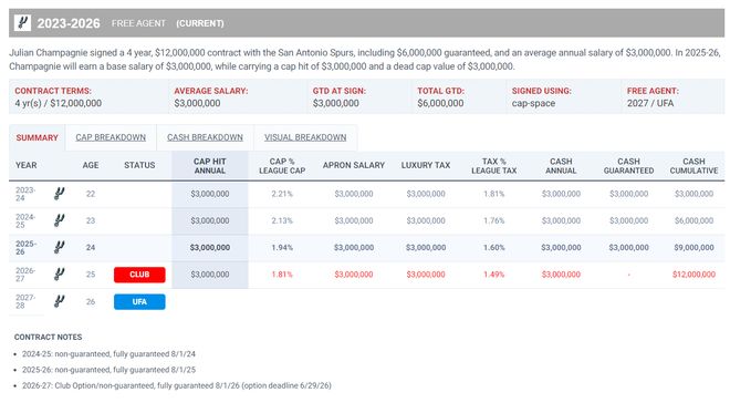 值得一提的是尚帕尼是一位落選秀,他跟馬刺簽下的合同是四年1200萬,他本賽季的年薪是300萬,下賽季他的合同還是300萬,這位24歲的身高2.01米的投手一戰成名了。