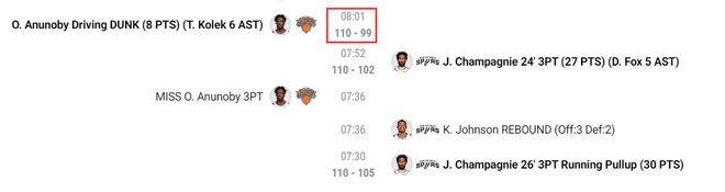 終場前8分01秒阿奴諾比暴扣後尼克斯已經領先11分,隨後尚帕尼進入了Zone的狀態,7分52秒尚帕尼命中三分,7分30秒再進三分,5分02秒第三個三分,4分34秒第四個三分球,從這裏開始兩隊已經打成116-116,尚帕尼這四個三分太關鍵了。