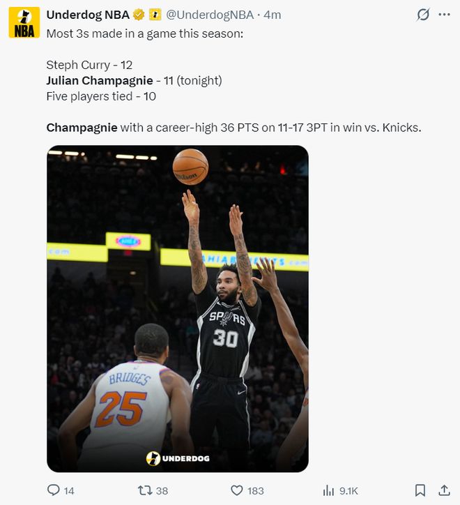 轟36+11三分創九紀錄!198秒4記關鍵3分 馬刺300萬投手一戰成名
