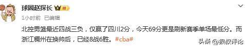 媒體人球圈趙探長發文點評:北控男籃最近四戰三負,僅贏了四川2分,今天69分更是刷新賽季單場最低分。而浙江稠州在換帥後,已經8戰6勝。