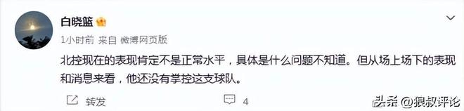 媒體人白曉籃發文點評:北控現在的表現肯定不是正常水平,具體是什麽問題不知道。但從場上場下的表現和消息來看,他還沒有掌控這支球隊。