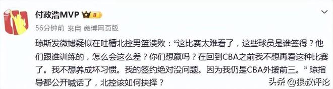 瓊斯發微博疑似在吐槽北控男籃潰敗:“這比賽太難看了,這些球員是誰簽得?他們跟誰訓練的,怎麽會這麽差?你們想贏嗎?在回到CBA之前我不想再看這種比賽了。我不想養成壞習慣。我的簽約絕對沒問題。因為我仍是CBA外援前三。” 瓊指導都公開喊話了,北控該如何抉擇?