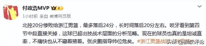 媒體人付政浩發文:北控20分慘敗給浙江男籃,最多落後24分,長時間落後20分左右。咬牙看到第四節中段直接關掉,這球已超出技戰術層麵的分析範疇。現在的球員也真的是坦誠直率,不痛快也從不藏著掖著。張慶鵬指導帥位危矣。