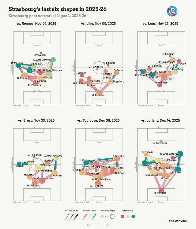 斯特拉斯堡可以根據對手切換陣型,其多變性允許羅塞尼爾在通常為3-4-2-1的三後衛體係,與4-3-3或4-2-3-1的四後衛體係之間交替。這在下麵的近期傳球網絡圖中得以體現。