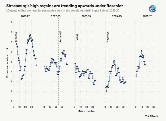 這一點清晰地體現在羅塞尼爾2024年上任以來的更廣泛趨勢中,其前任帕特裏克-維埃拉執教時期的高位奪回球權率較低。在上賽季末趨於平穩後,本賽季斯特拉斯堡在進攻三區奪回球權的次數呈上升趨勢——在2025-26賽季的法甲中,隻有巴黎聖日耳曼的高位奪回球權後形成射門的次數(5次)比他們更多。