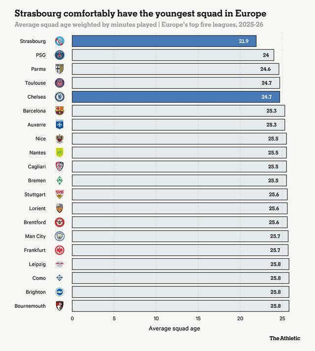 切爾西球迷已經看到了BlueCo商業模式的效果,即投資年輕天才並在他們成長過程中提升其價值,但斯特拉斯堡將這一理念提升到了另一個層次。平均年齡21.9歲,斯特拉斯堡輕鬆擁有歐洲五大聯賽中最年輕的陣容——比最接近的俱樂部(巴黎聖日耳曼,24歲)年輕兩歲多。